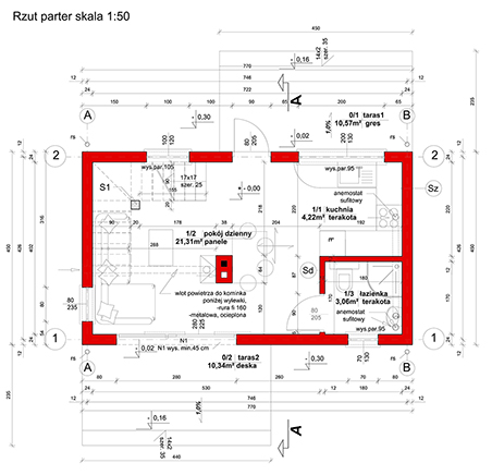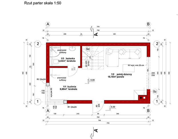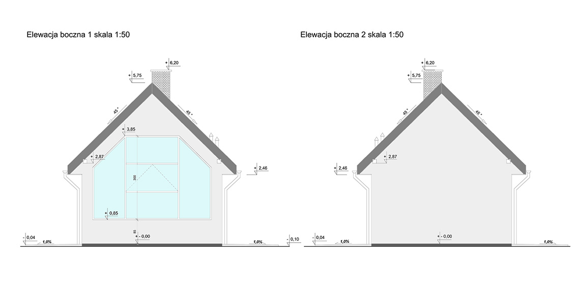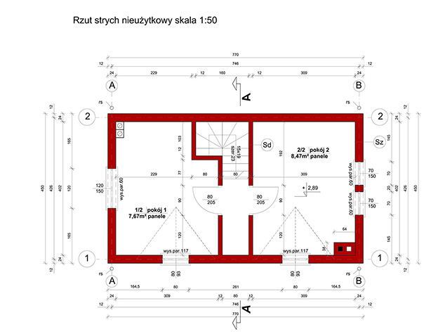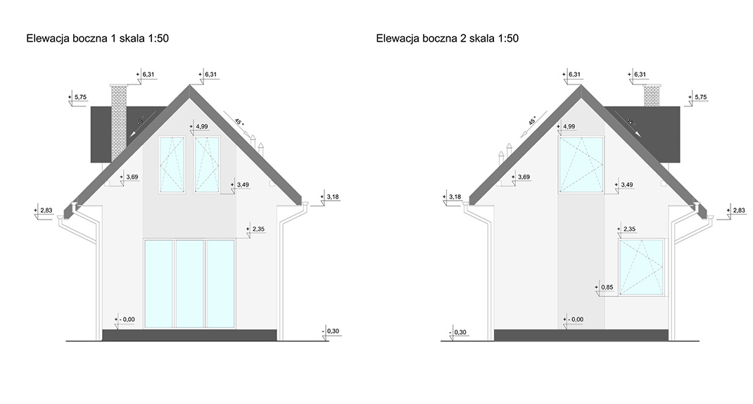 - wysokość budynku 7.69 m / ścianka kolankowa 1.85 m