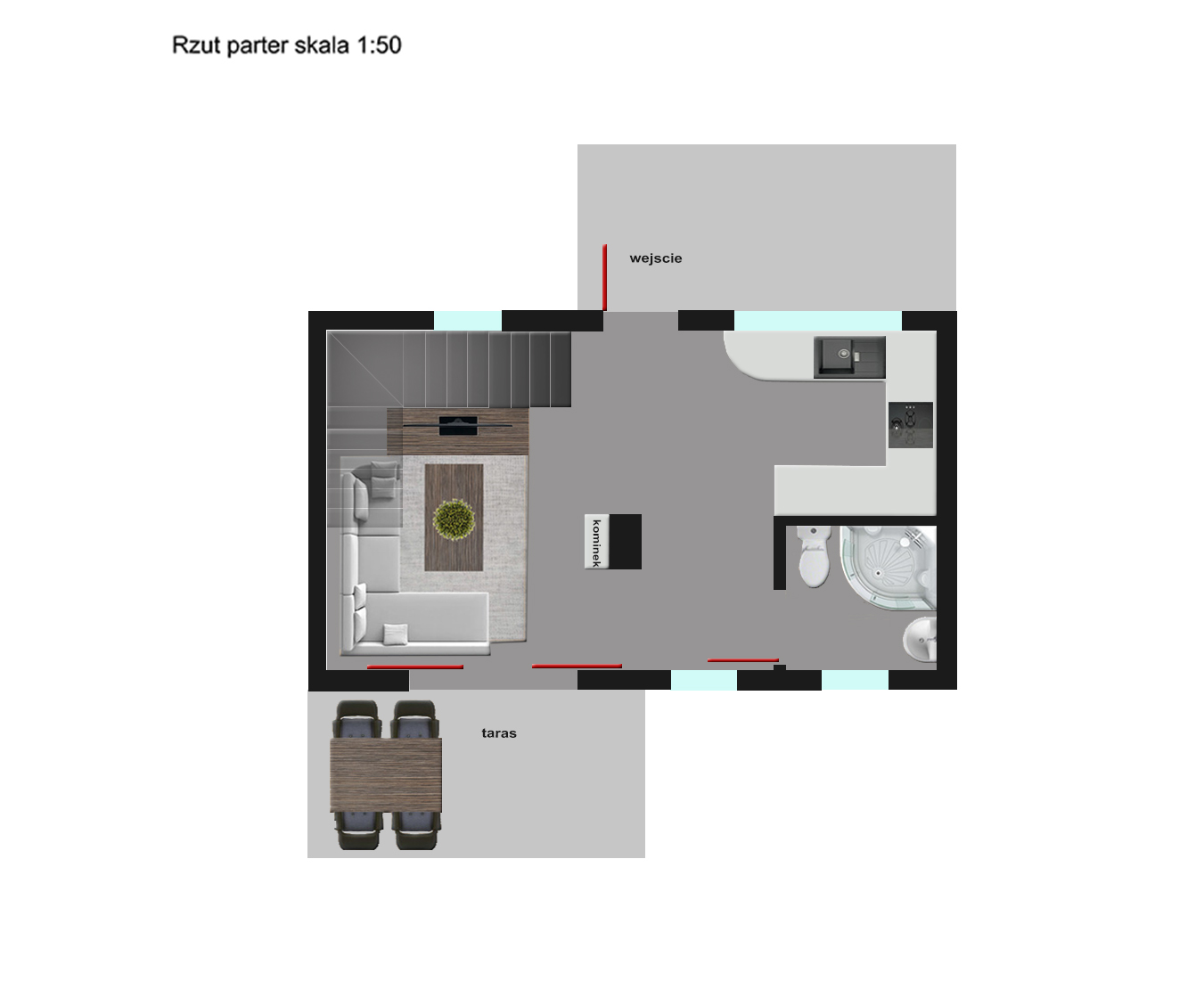 Na parterze: kuchnia z jadalnią, salon, pokój, łazienka a po zmianie sposobu użytkowania można zrobić na strychu 2 sypialnie.