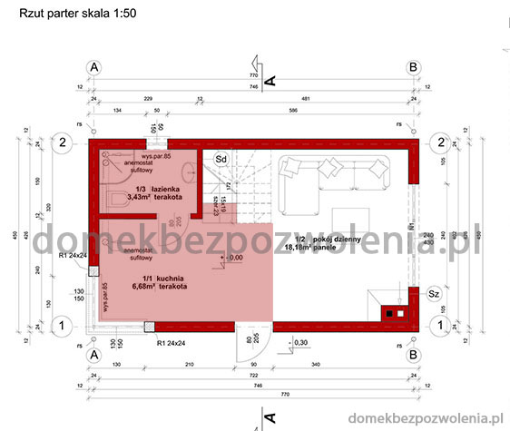 Na parterze: kuchnia z jadalnią, salon, pokój, łazienka a po zmianie sposobu użytkowania można zrobić na strychu 2 sypialnie. projekt Domu 35m2 z Antresolą