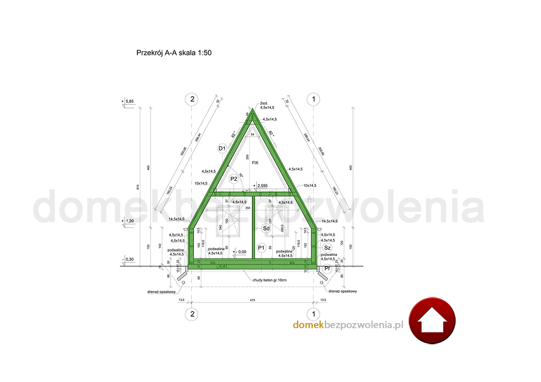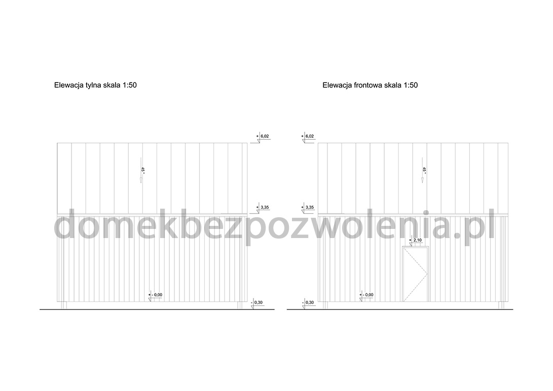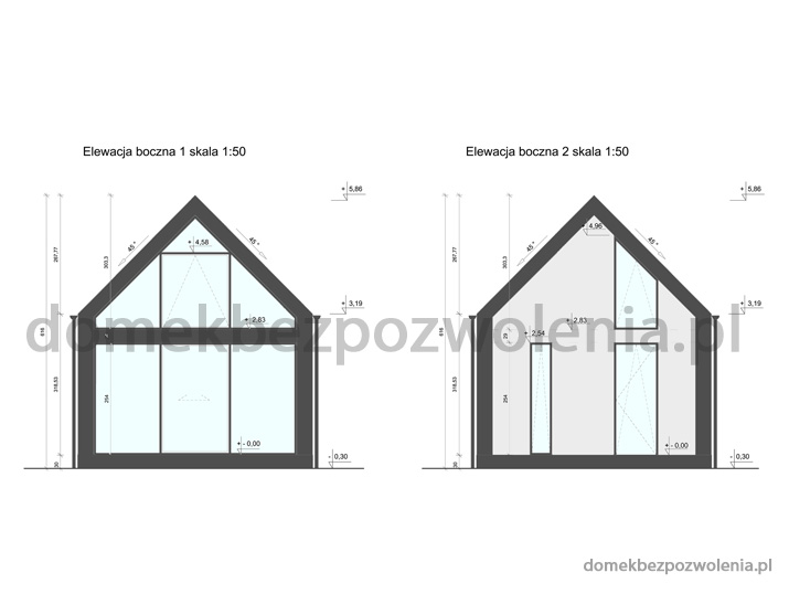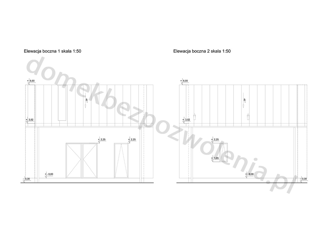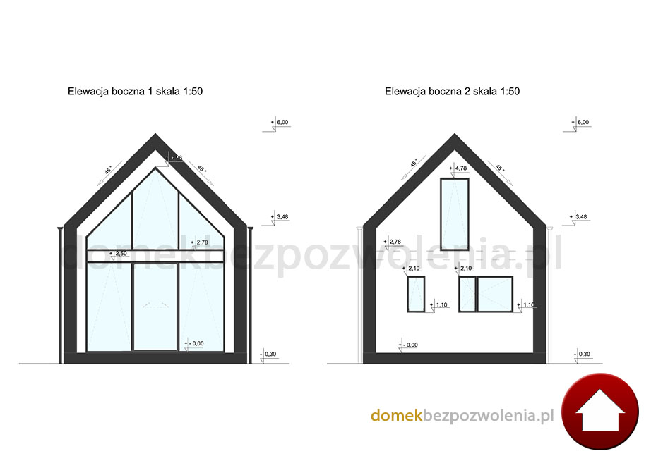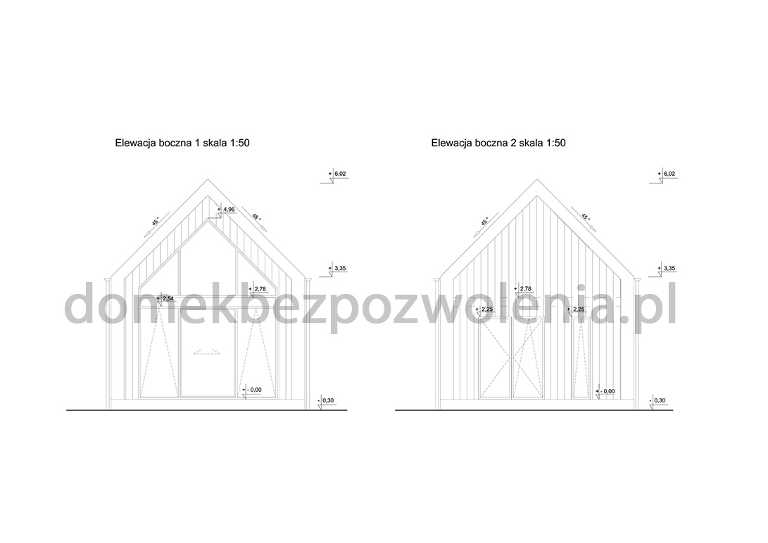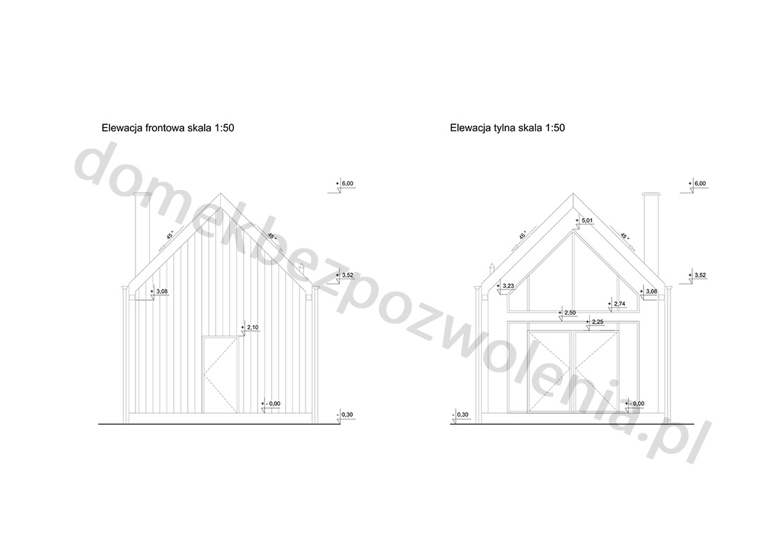 - wysokość budynku 6.01 m / kąt dachu 45°