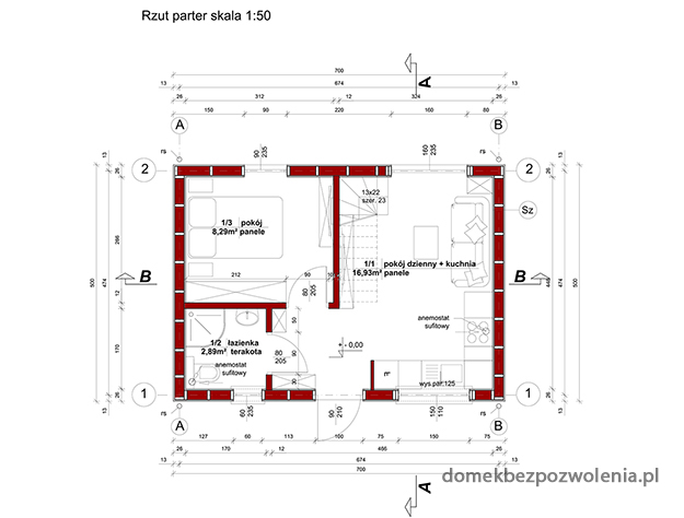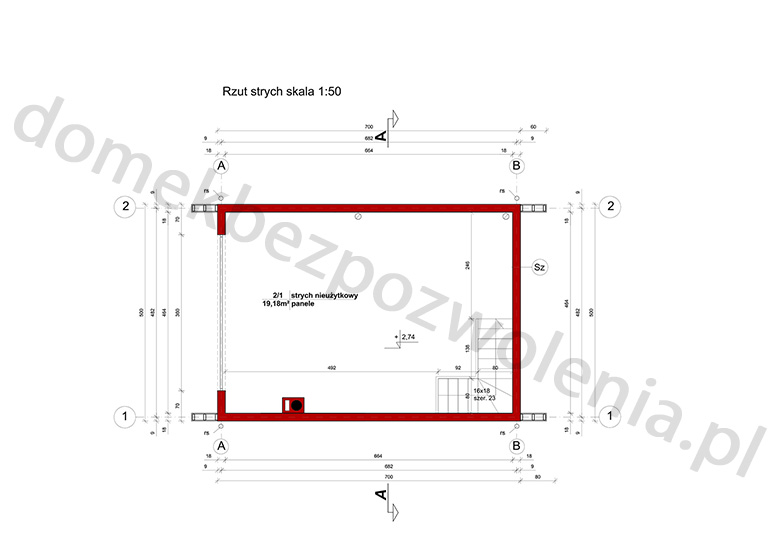 - wysokość budynku 6.55 m / ścianka kolankowa 54 cm