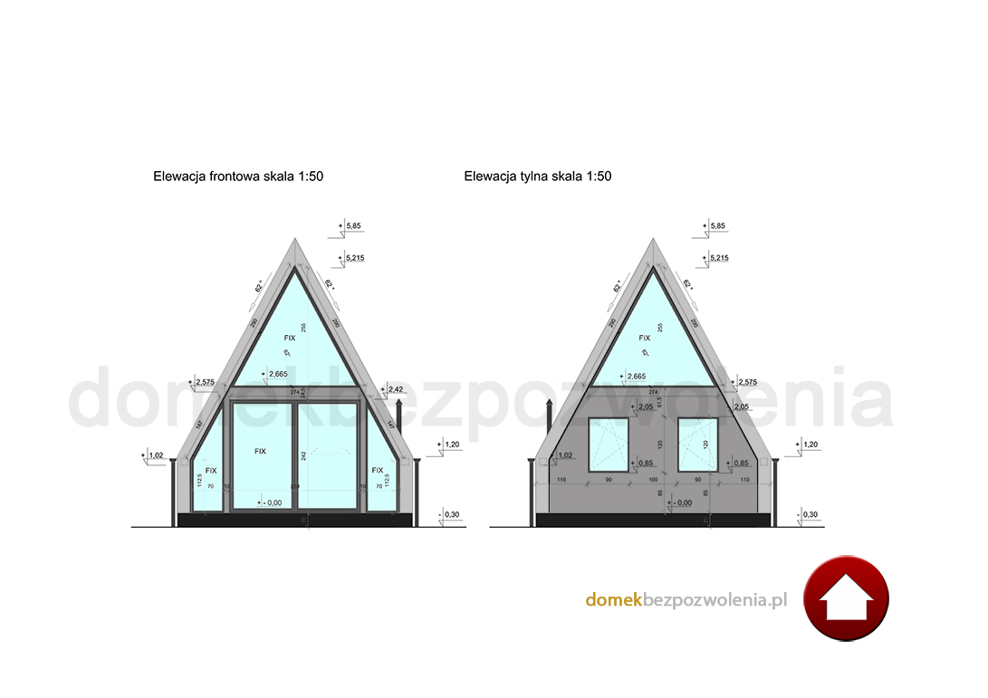 - wysokość budynku 6.16 m / kąt dachu 45°