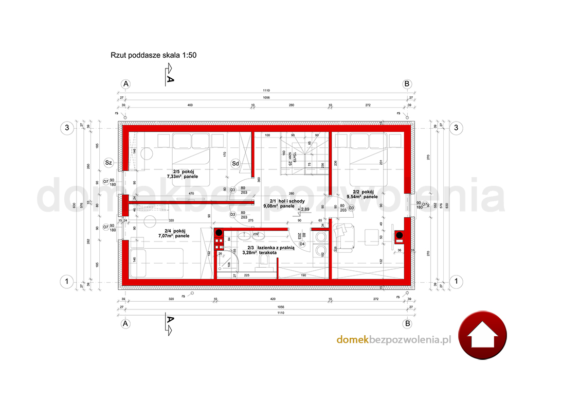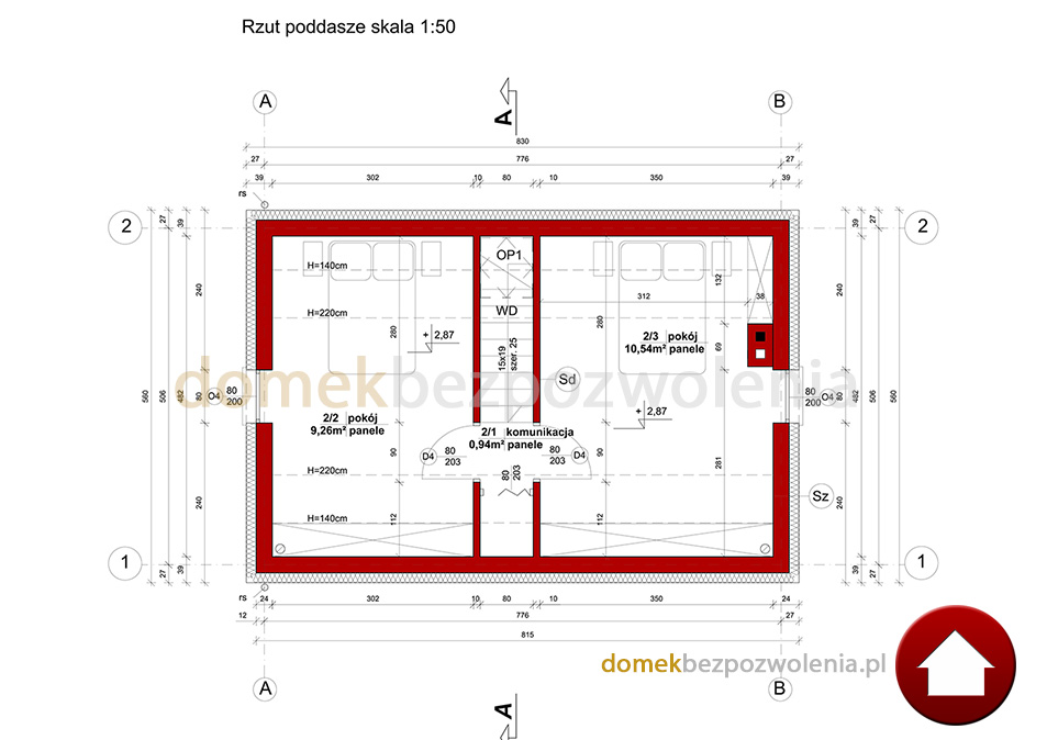 Poddasze - sypialnia (9,26m2), sypialnia (10,54m2), komunikacja (0,94m2).