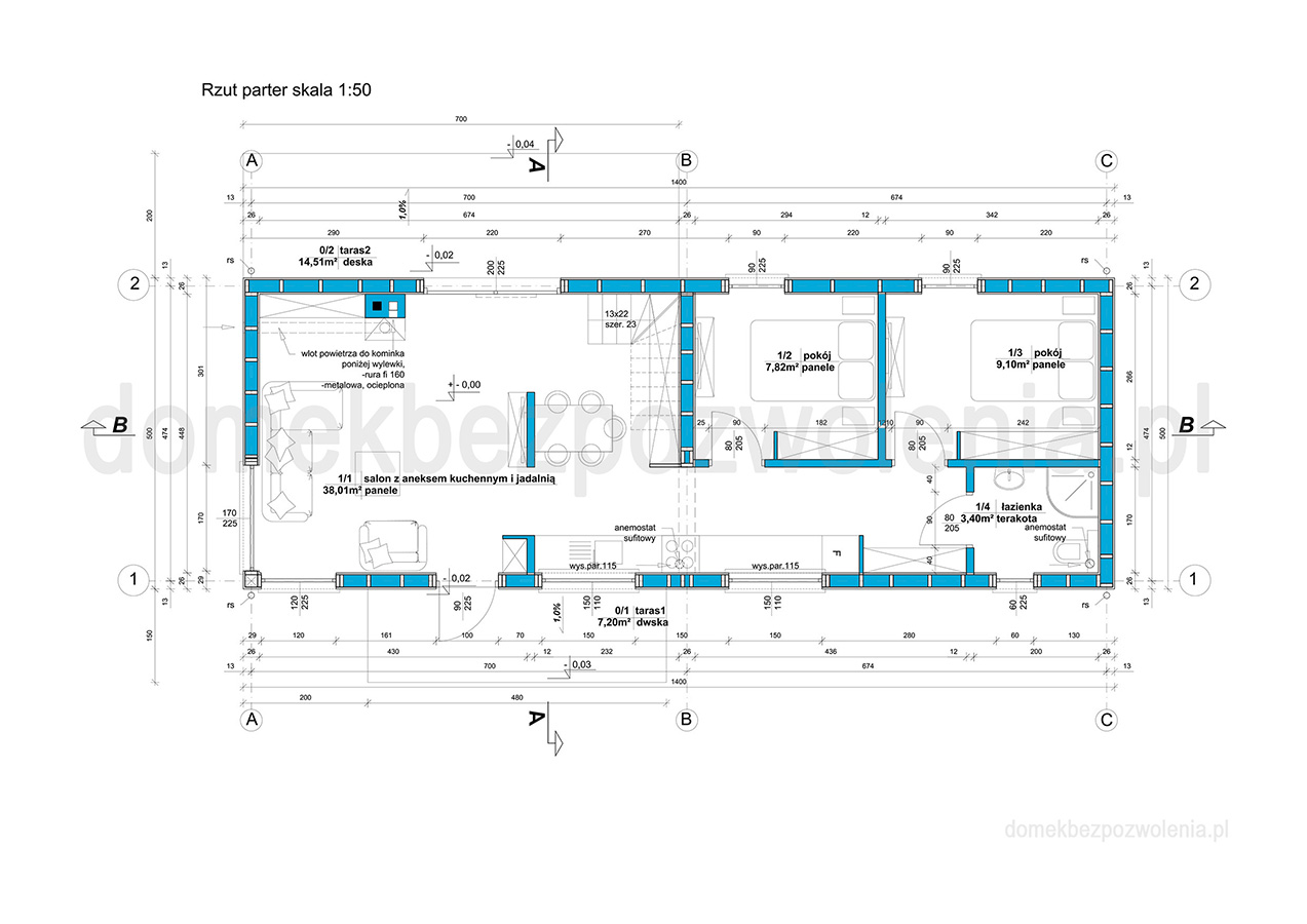 Na parterze: salon z aneksem kuchennym i jadalnią (38,01m2), łazienka (3,40m2), sypialnia/gabinet (7,82m2), sypialnia (9,10m2).