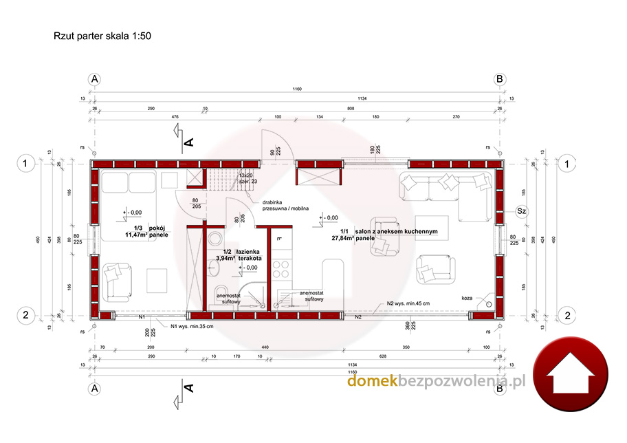 Na parterze (wersja szkieletowa): salon z aneksem kuchennym (27,84m2), łazienka (3,94m2), sypialnia (11,47m2)