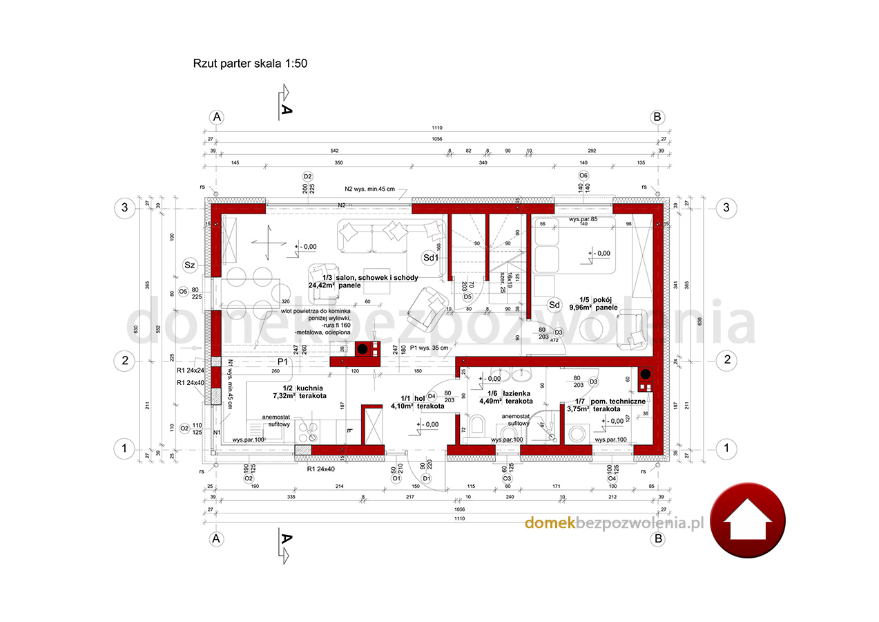 Na parterze: salon z aneksem kuchennym (23,88m2), łazienka (4,02m2)