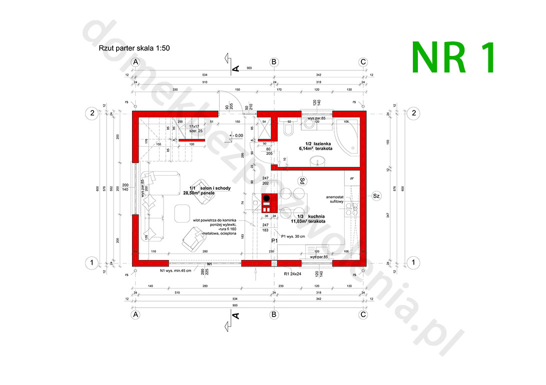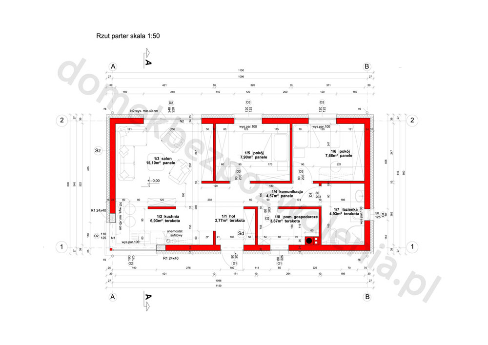 1/1. Hol - 5,80m2 / terakota, 1/2. Kuchnia - 8,96m2 / terakota, 1/3. Salon - 21,97m2 / panele