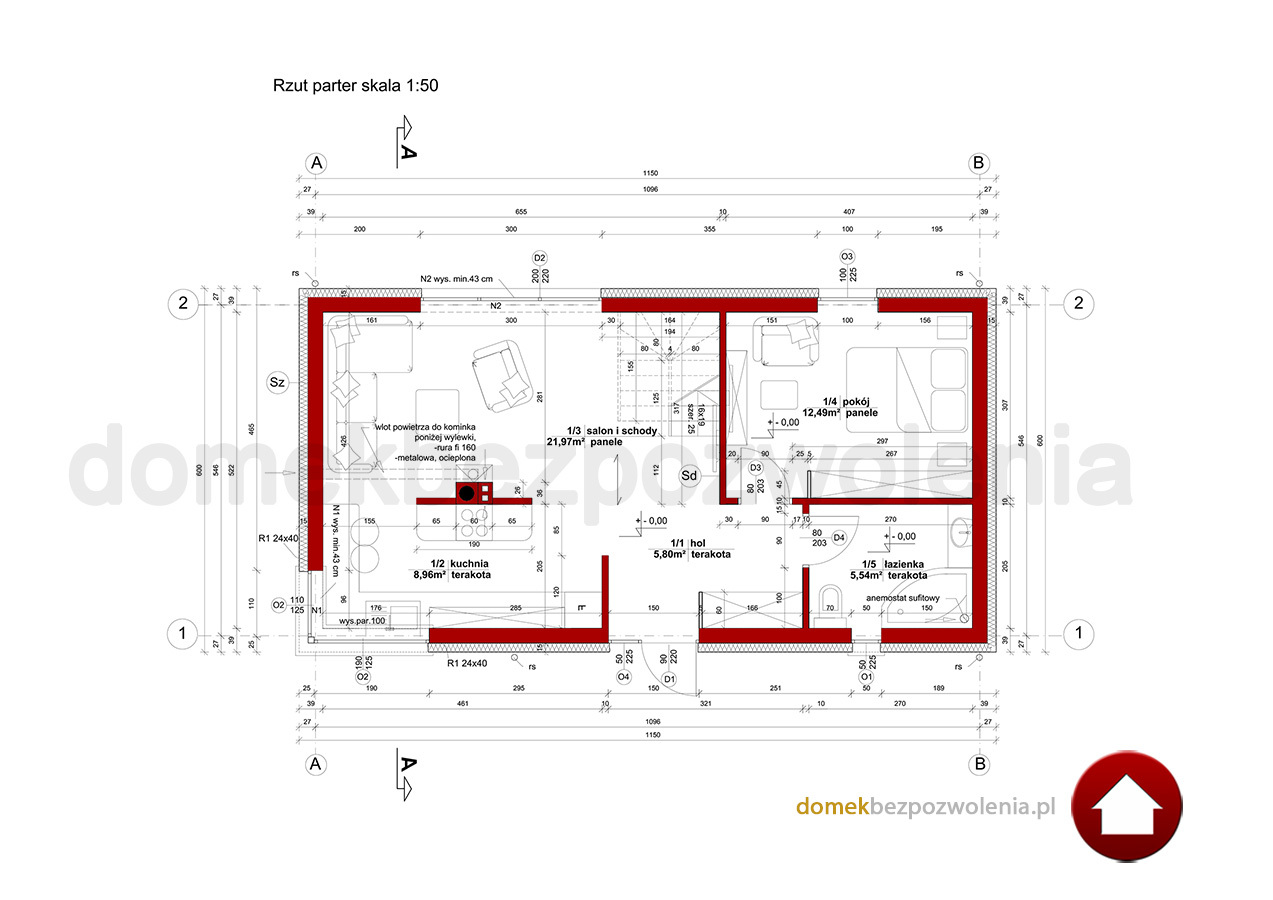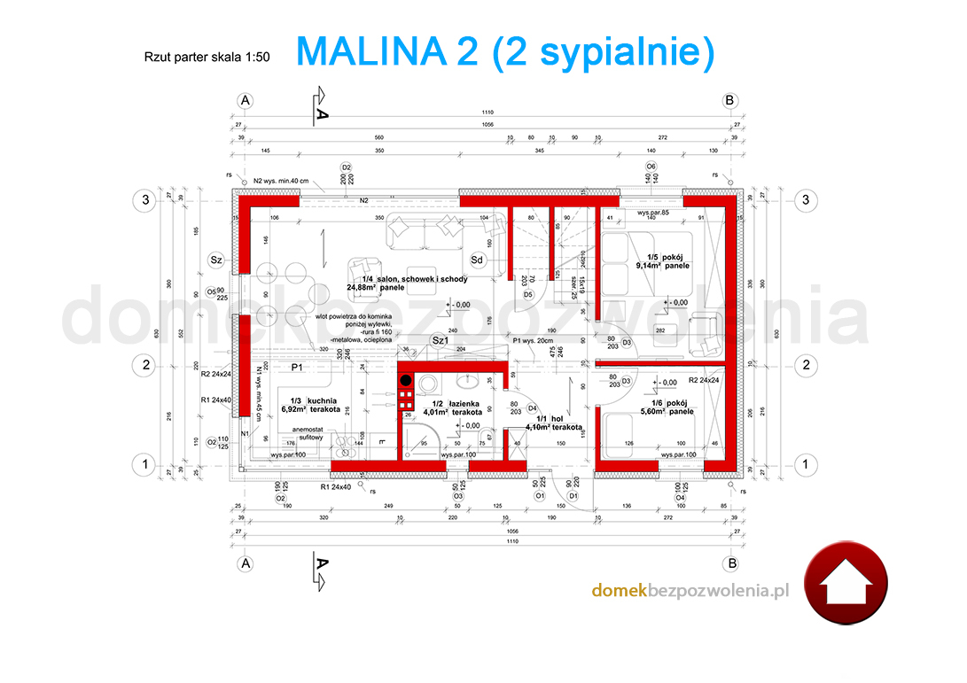 Wymiary domu 9.00 m x 6.00 m ( 54m2 zabudowy )