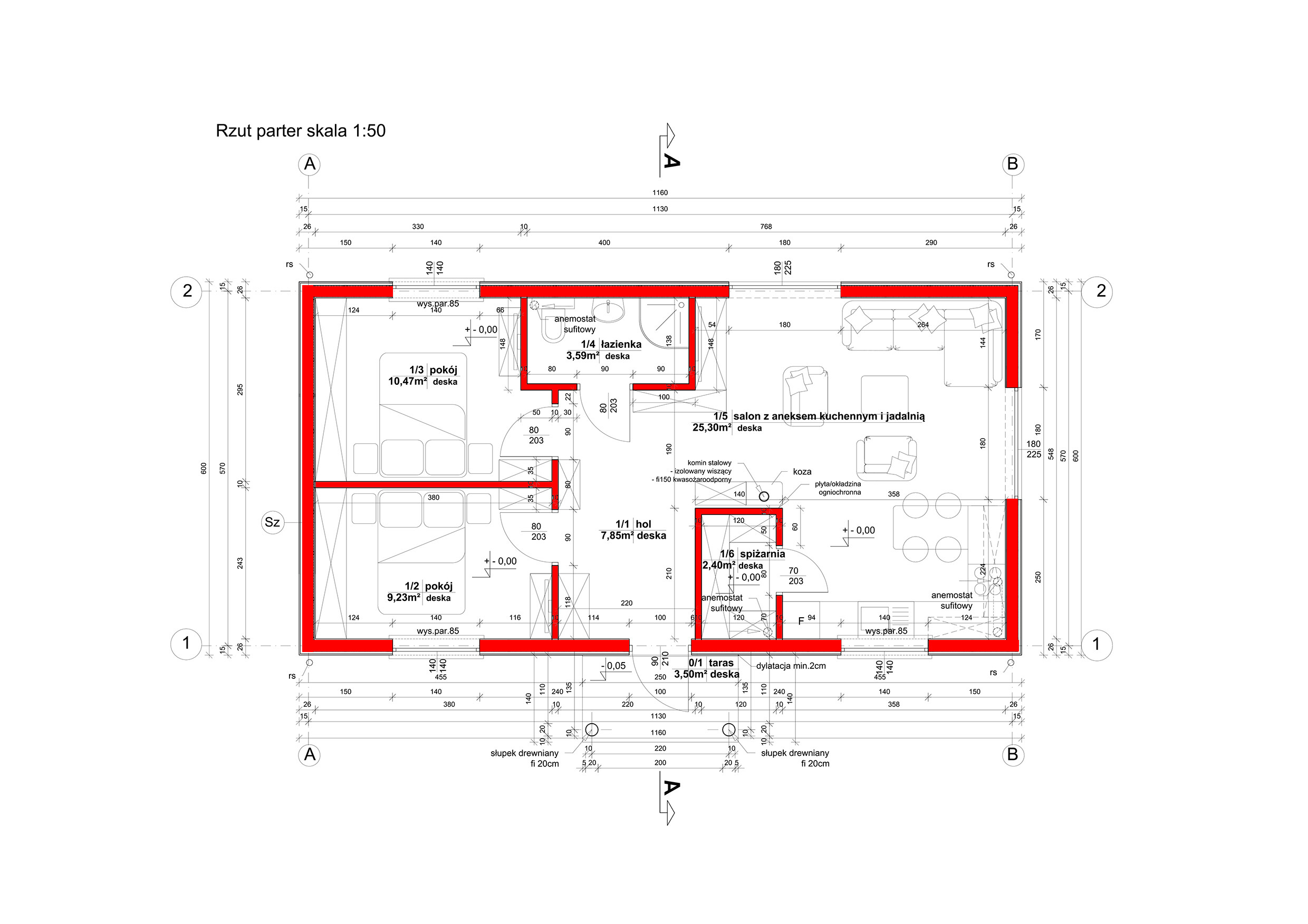 - ściany z belek 6x20 cm w rozstawie co 60 cm, między belkami wełna mineralna.