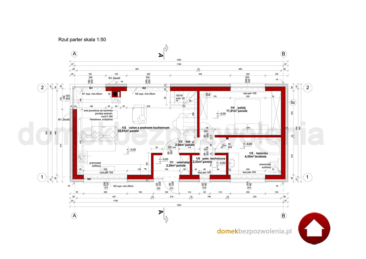 - wysokość budynku 6.95 m / ścianka kolankowa 49cm
