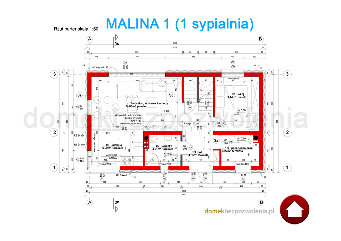 Na parterze: Hol (4,85 m2), Łazienka (4,01m2), Kuchnia (6,92m2), Salon + Pom. gospodarcze +schody (24,88m2), Pokój (9,14m2), Pom. techniczne (4,27m2).